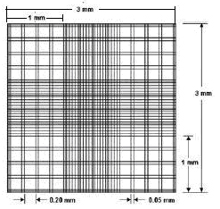 The full grid on a hemocytometer contains 9 squares, each of which is 1 micro meter (mm) square. Large cells are counted using the four large corner squares (and the middle one). For a dense suspension of small calls, the four 1/25 sq. mm corners plus the middle square and the central square are used. It consists of 9 large squares, each measuring 1 x 1 mm, with the depth of chamber of 0.1 mm. Each square has a total volume of 0.1 mm3 or 10-4cm3. The central square is divided into 25 small squares with triple lines and four corner squares divided into 16 small squares. Each large square has a surface area of 1.0mm2, and a chamber depth of 0.1mm. There are 1000 mm3 per ml, each large square represents a volume of 0.0001ml, that equates to 1/ 0.0001ml = 10,000 = (104). The volume factor is 10,000. |