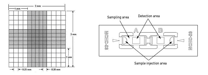 DHC-N01, C-Chip disposable hemacytometer, has two precision engineered individual counting chambers (100 mm depth) with integrated cover slip. The chamber has ports for sample loading. Neubauer Improved (NI) grid pattern is embedded in each chamber. Each grid pattern has nine large squares each measuring 1 x 1 mm and a total counting area of 3 x 3 mm. |