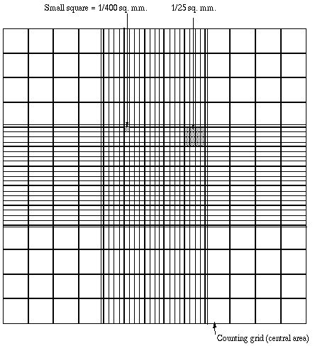 The full grid on a hemocytometer contains 9 squares, each of which is 1 mm square. Large cells are counted using the four large corner squares (and the middle one). If you use a dense suspension of small cells, the four 1/25 sq. mm corners plus the middle square in the central square are used. The grid consists of 9 large squares, each measuring 1 x 1 mm, and a chamber depth of 0.1 mm. Each square has a total volume of 0.1 mm3 or 10-4cm3. The central square is divided into 25 small squares with triple lines and four corner squares are divided into 16 small squares. Each large square has a surface area of 1.0mm2, and the depth of the chamber is 0.1mm. As there are 1000 mm3 per ml, each large square represents a volume of 0.0001ml, so that it is equal to 1/ 0.0001ml = 10,000 = (104) |
